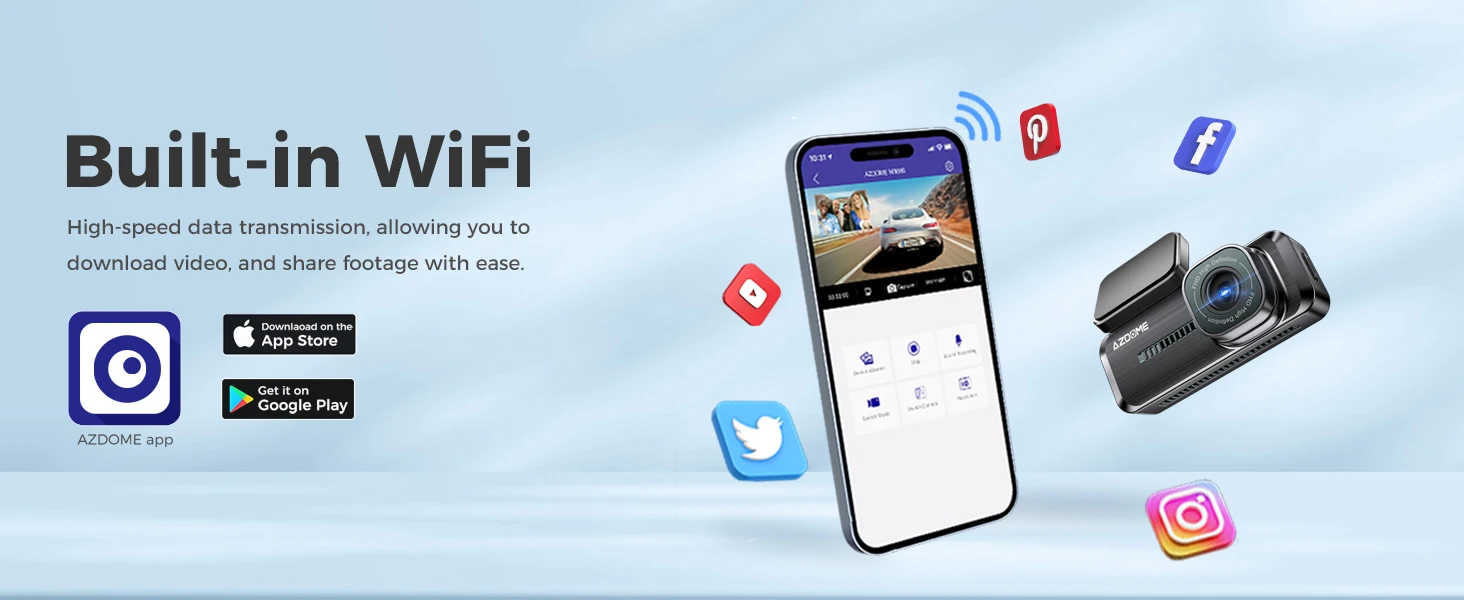 - La cámara de tablero WiFi admite a los usuarios ver, compartir y descargar vídeos en tiempo real a través de WiFi.La aplicación AZDOME podría reproducir vídeo inmediatamente después de un accidente de emergencia.